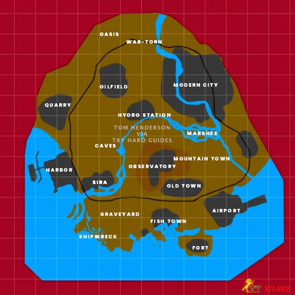 در ارتباط با Try Hard Guides، تام هندرسون، اینسایدر شناخته شده، تصویری از نقشه منتشر کرده است (در زیر می توانید آن را مشاهده کنید)، تمام نقاط مورد علاقه (POI) و چندین ویژگی قابل توجه از جمله مقدار قابل توجهی آب را نشان می دهد.